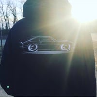 This clean CARtooned graphic is printed large on the back with a small graphic on the front.